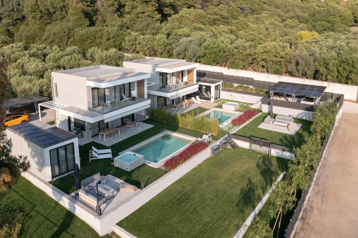 Two-Bedroom Villa. This luxurious villa has a pool with a view, a hot tub and a fireplace. Boasting a private entrance, this air-conditioned villa comes with 2 living rooms, 2 separate bedrooms and 2 bathrooms with a bath and a shower. Guests will find a stovetop, a refrigerator, a dishwasher and kitchenware in the kitchen. The villa also includes a barbecue. Featuring a terrace with sea views, this villa also features a washing machine and a flat-screen TV with cable channels. The unit has 4 beds.
